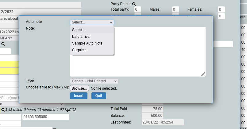 Next time you wish to add a note to a booking, go to the Add button and choose Add note where you will find a drop down, and your auto notes will be on this dropdown list. Or you can add a new unique note as you wish.