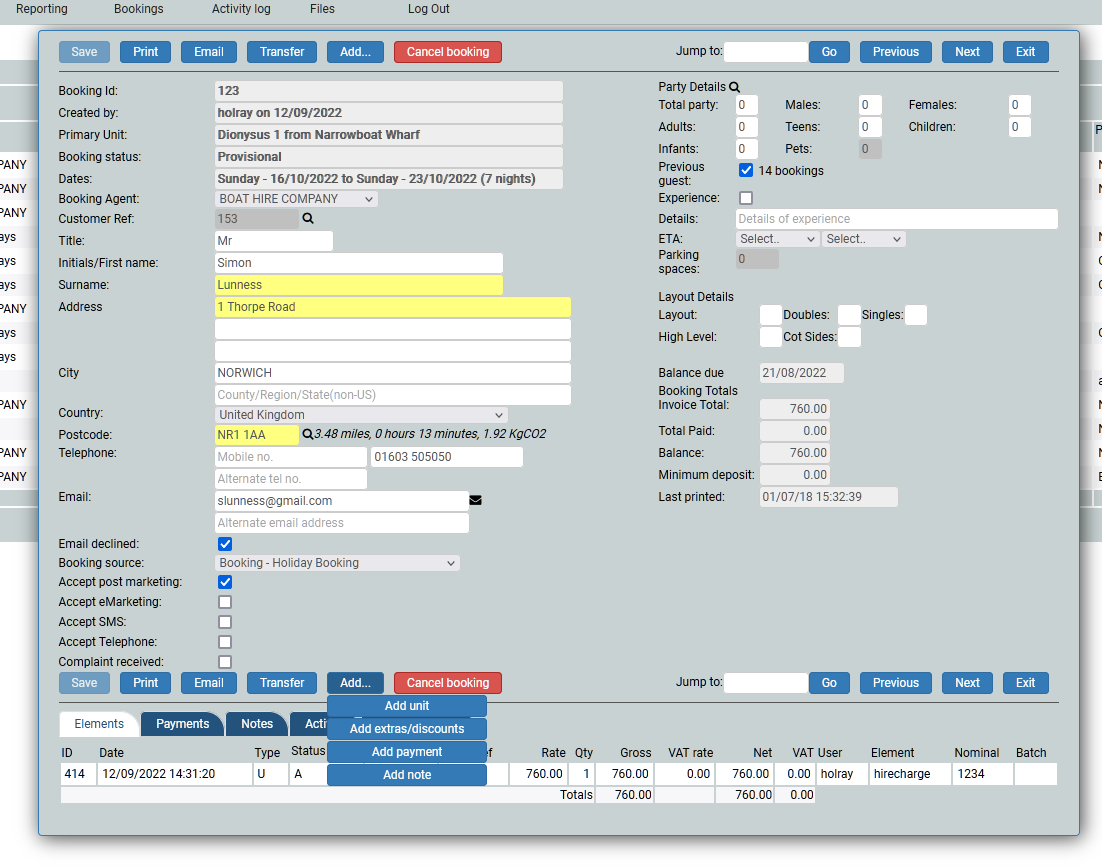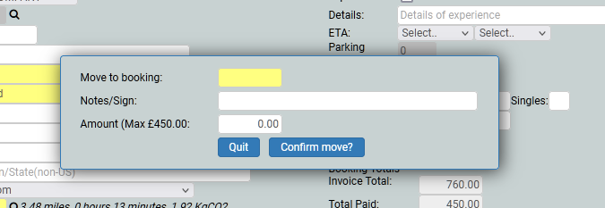 You may want to move the money to another booking, for example, a group of friends are booking several boats, and one person is paying for all of them, and wants you to split the monies between the bookings, rather than having several payments. Go to the Add button and choose Move Money from the drop down. Put in the booking reference for the receiving booking, add the amount you wish to apply to that booking and click Confirm Move. You can repeat the process as many times as you wish.
