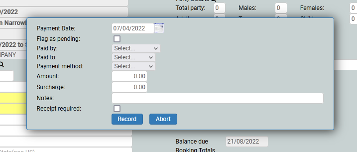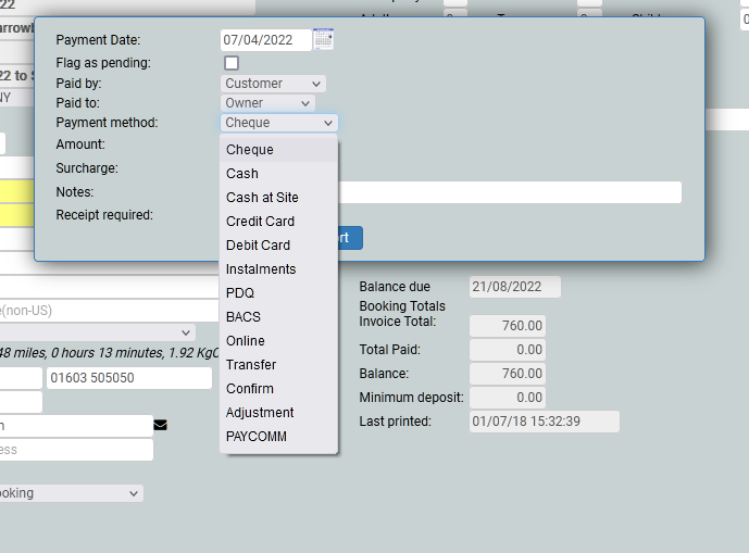 A booking will only be confirmed when a payment has been received against it. To take a payment you will need the customer's card details (this will be a MOTO payment as it falls under the category of Mail Order Telephone Order and the customer, although on the telephone, is not present for the transaction) and click the Add button, and choose Payment.