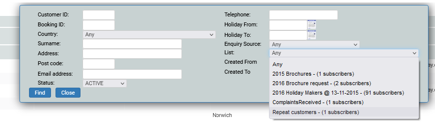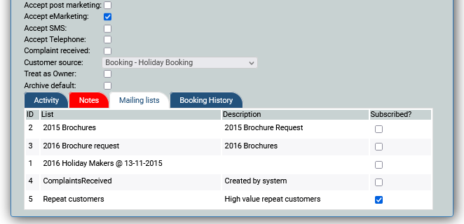 To add a customer to our “Repeat customer” list we simply find our customer record and click on the “lists” tab. We then “tick” the check-box against the list(s) to which we wish to attach the customer.