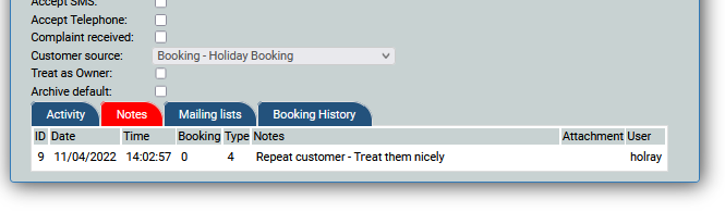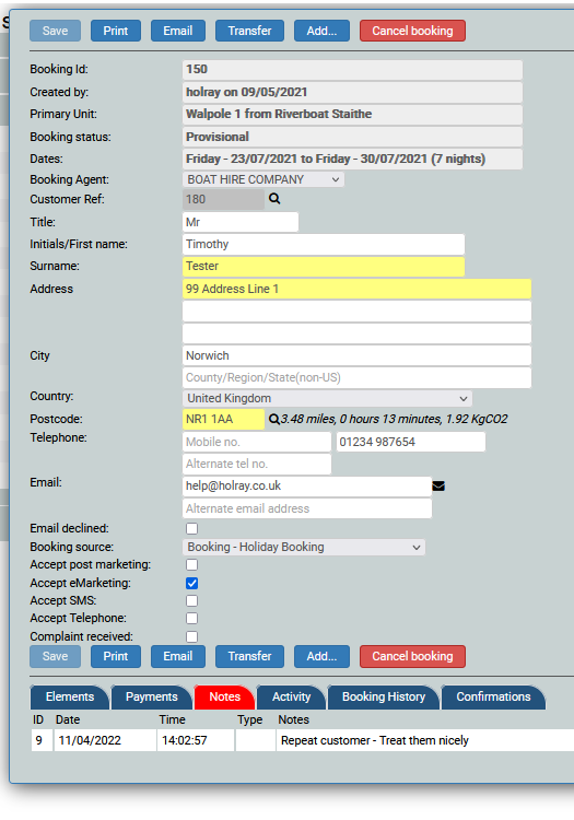 As mentioned above, customer notes shine through onto any booking for that customer, as below:-