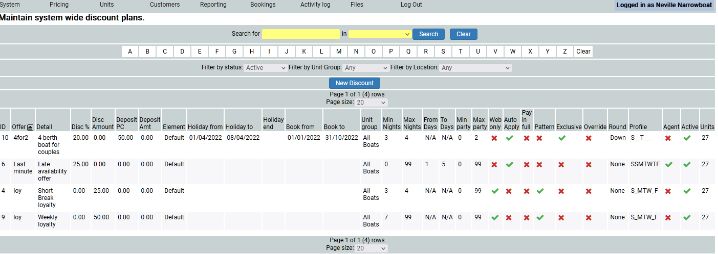 This is where you set your discounts for your system, rather than individual discounts for a specific booker (i.e. Friends and Family as they are created within Extras)