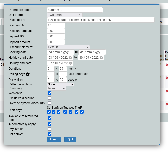 I might wish to set my discount for bookings made between certain dates but this discount is for holidays taken within specific dates, rather than booked. Because I do not mind how long the holiday is, I have set it to cover everything, hence 0 to 99, likewise with the number in the party. But I might want to resrict the holiday to a minimum of 3 days, or maximum of 4 people.