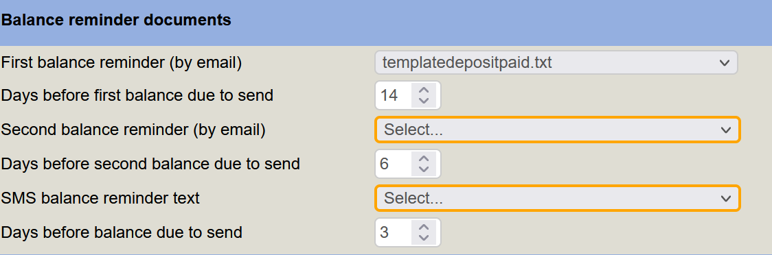 Here you can arrange for the relevant reminder documents to be sent to your customer to remind them that the balance is due. As you can see in the above image, the first balance reminder email goes out 14 days before it is due, 7 days later a second balance reminder goes out via email. You could also then select a text to be issued to the customer 3 days beforehand as well if nothing has been paid so far. Please note, SMS balance reminder texts require an SMS gateway account - talk to Holray if you wish to do this