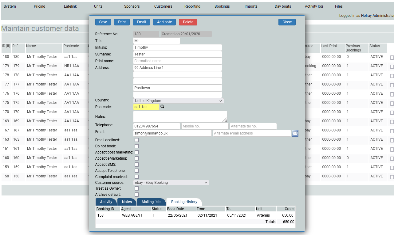 Clicking a customer link from the Customer table will open it for editing (see Maintain Customers), in our case we click the top row ID 180: