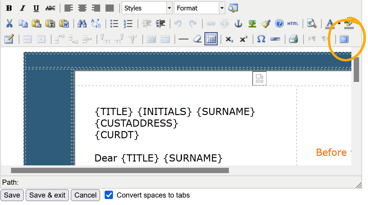 You are able to add your company logo to your letters. All you need to know is where the logo is “stored” i.e. URL. Go to the letter you want to add the logo to, choose 'Edit' and then toggle the page to full screen (it helps to see what you're doing!) At the very top of the letter in the header space is a funny little icon. You need to click this and then click the image icon above (a little tree).