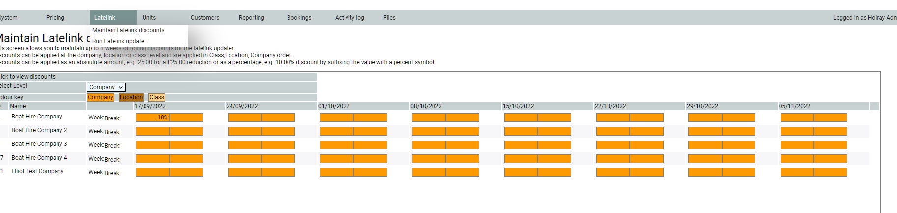 Latelink allows you to set and view the rolling 8 weeks discount plans to send to Latelink. It is not enabled by default, please ask us to have it enabled. You will aloso need to speak to Waterways Holidays.