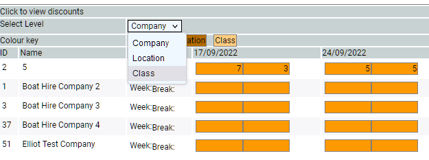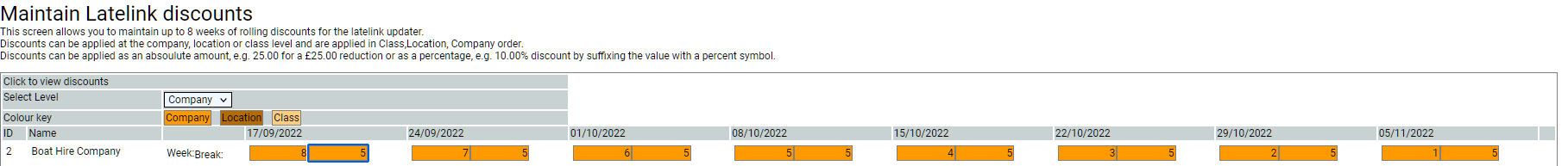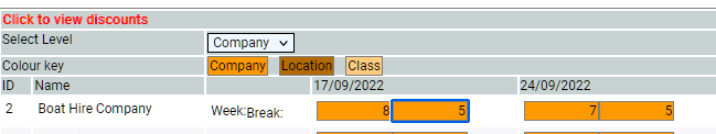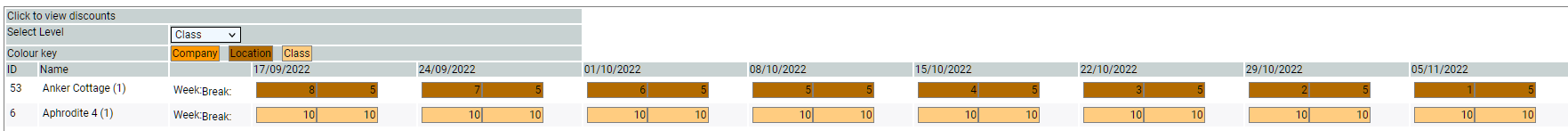 Discounts can be set at Company, Location or Class level. Initially the system shows the company level. There are 8 blocks of 2 across the page. Each of the 8 blocks represents the rolling 8 weeks of discount, with the first block being the nearest i.e. from your next start days but the usual is Friday to Friday. The 2 boxes in each box are the Weekly and Short-break prices.