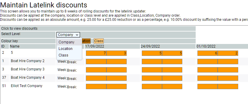 Discounts can be set at Company, Location or Class level. Initially the system shows the company level. There are 8 block of 2 across the page. Each of the 8 block represents the rolling 8 weeks of discount, with the first block being the nearest i.e. the next week. The 2 boxes in each box are the Weekly and short-break prices. Prices can be entered as a fixed amount e.g. 25.00 for a £25.00 reduction, or, as a percentage e.g. 10% for a 10% discount. Discounts “shine” through to all the levels below, i.e. if a discount is set at the company level it shines through to the location and class levels. Discounts set at the lower levels override any higher level settings. You do not need to specifically save a value, tabbing (or exiting) the field after changing the value is sufficient to save it.