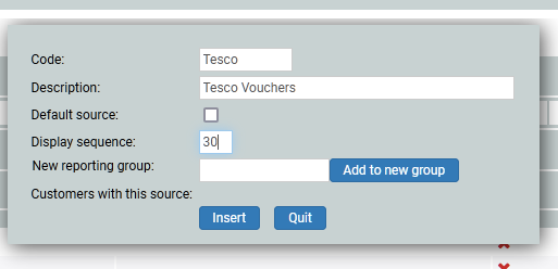 In this example, I am adding Tesco vouchers. The code is Tesco, and the description is Tesco Vouchers. This will appear as Tesco - Tesco Vouchers on the drop down.
