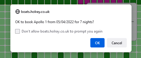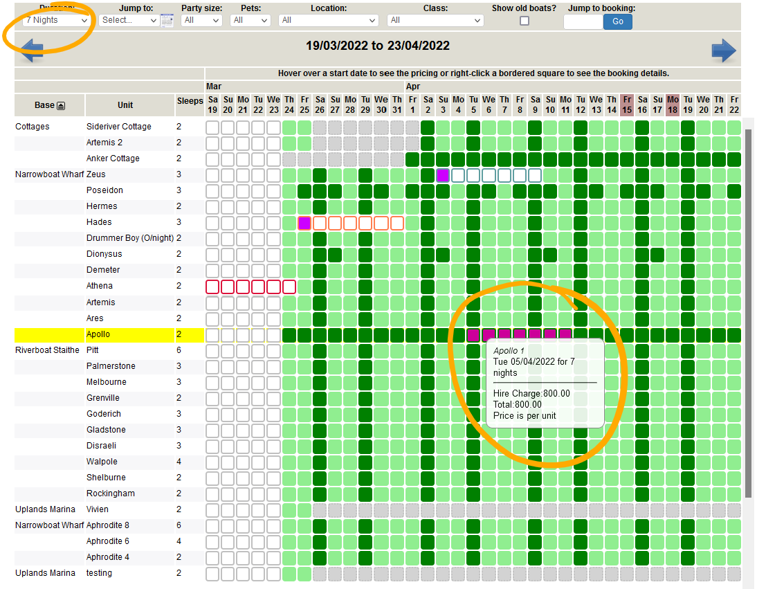 Lets assume someone wants to book onto Apollo for 7 nights starting on Tuesday 5th April 2022. As you can see, the duration drop down box is selected to 7 nights and we can see that Apollo is available on those dates.