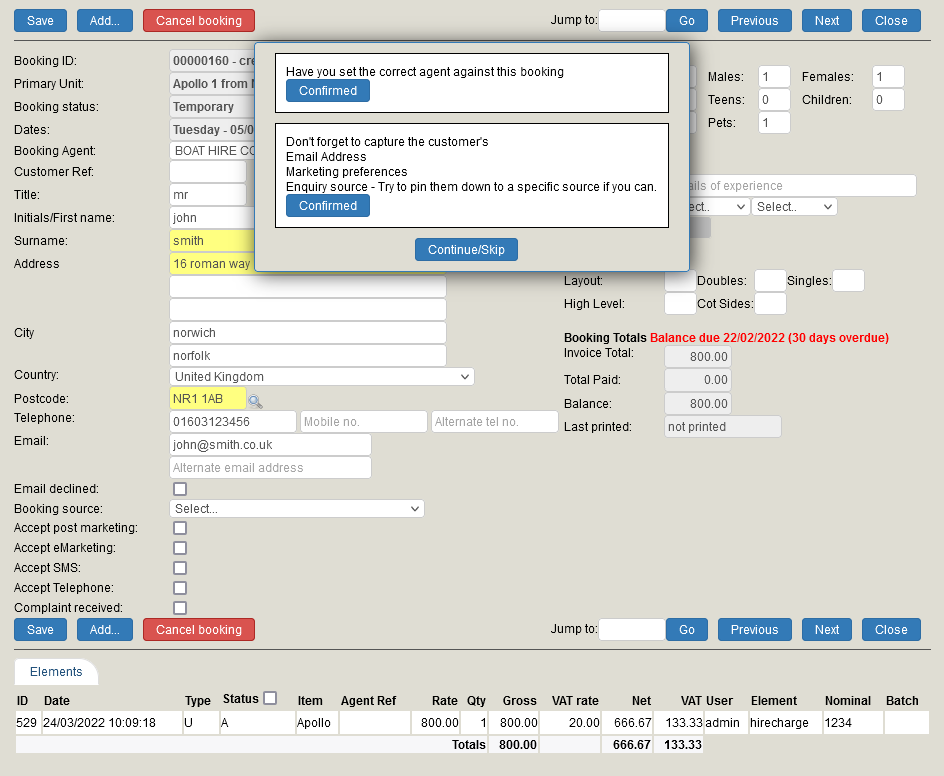 A handy little pop up box will appear just to make sure you have filled in certain aspects of the booking. You can choose to ignore this.