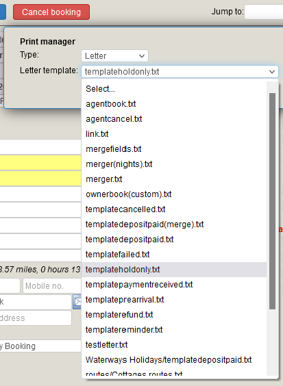 This is a list of all your document templates (stored in Files). In this case, the correct template has been automatically selected but you are able to override this by clicking on another template instead. Once you have selected your template, click Print and it shall open.