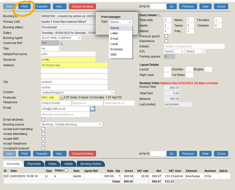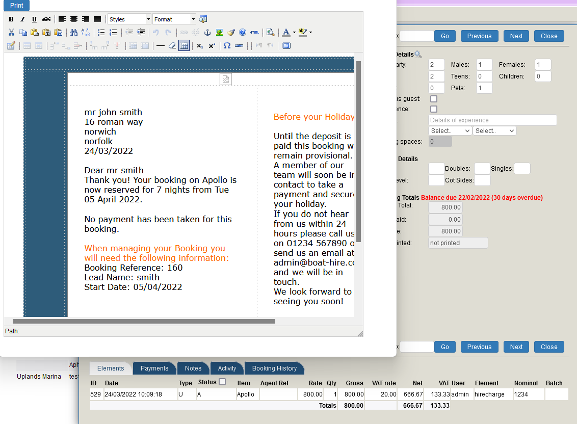 Once your booking has been created, you can send the customer an email / letter with some extra information on. Including important details such as payment requests.