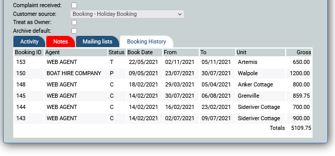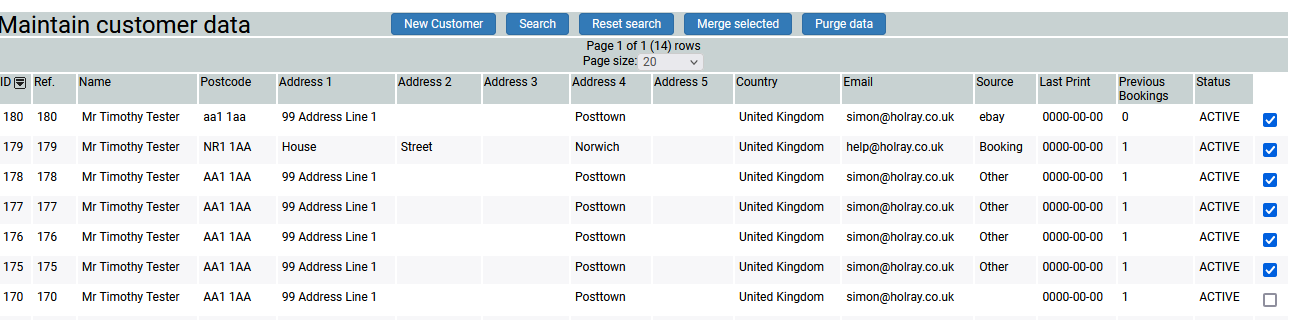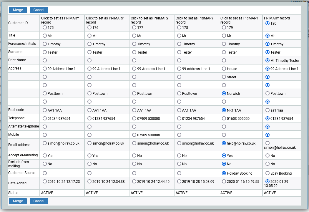 Over time you may end up with multiple customer records for the same customer, either where a customer has booked multiple times via the web and a new record is created each time or where mutliple bookings have been taken over the phone without searching for the customer, via the search option on the booking.