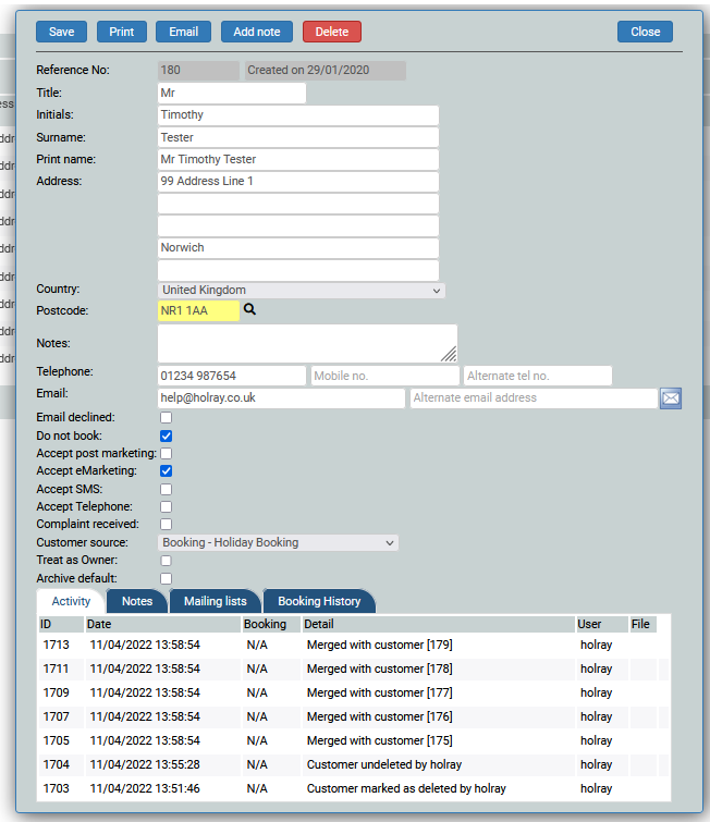 When the merge button is clicked, any bookings against any other records will be disconected and attached to the primary record and the primary record will be updated with any values selected from the other customer records. Finally the “unused” records will be marked as Deleted and you will be returned to the primary booking, as below:-