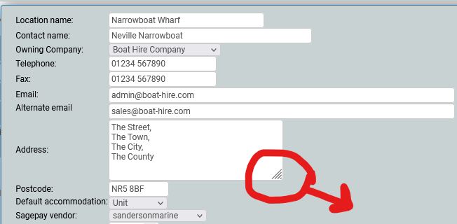 Some text areas, addresses for example, will accept a larger multi-line input but by default will show as a normal single line text field. To enlarge the box, left click the handle in the bottom-right corner and whilst still holiding the left button down drag to resize. Release the mouse button when you're done.