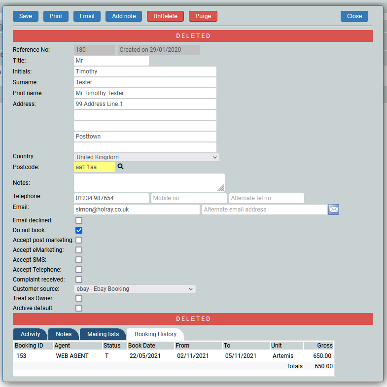 If you have a deleted customer and wish to reinstate them you can edit their record and click the undelete button, see below:-