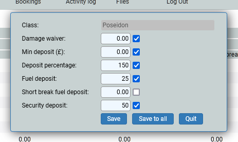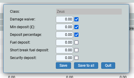 This screen is where you set the deposits (for when it is the same rate or amount across your fleet), damage waiver, fuel deposits and a security deposit. You do not need to set any of these, but deposits are the most popular charge, to secure a booking.