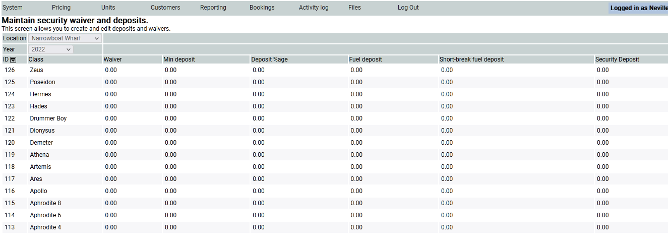 Choose one of your units, in this case I have chosen Zeus, and a pop up window will appear. Complete the relevant inputs, in most cases customers have a 20 % or 25% deposit, some have a fuel deposit of about £100 for the week and £75 for a short break and so on.